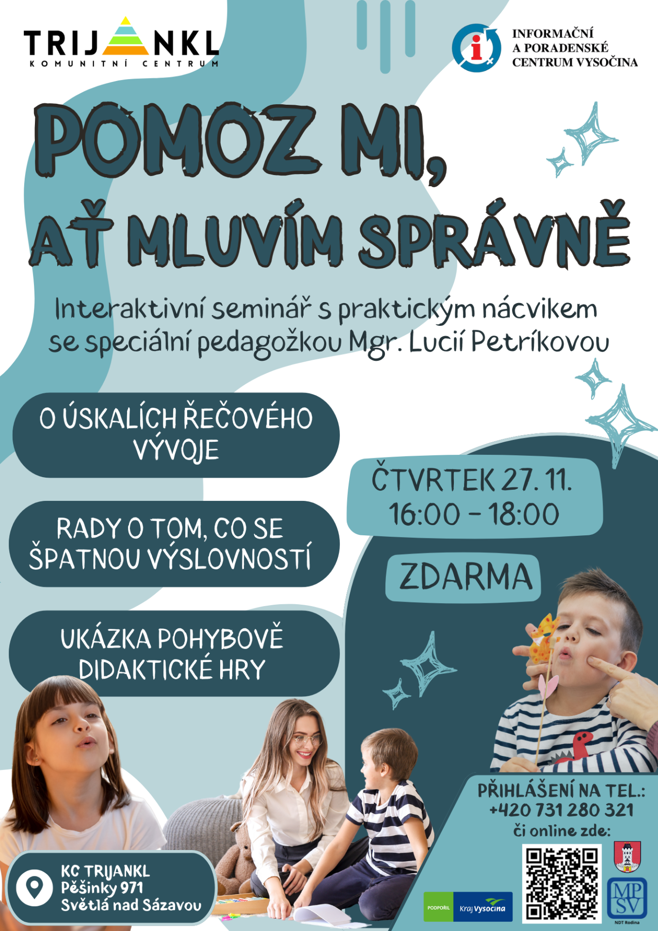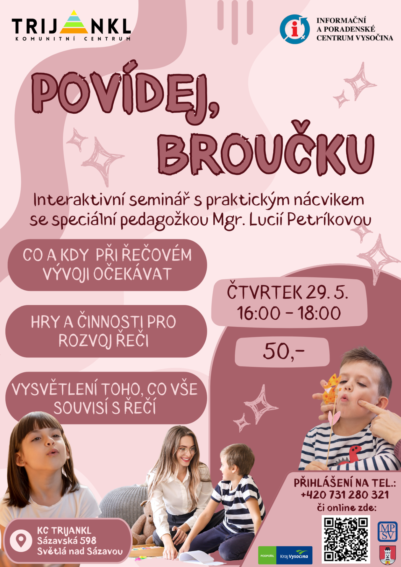 Přijďte na náš interaktivní seminář ,,Povídej, broučku" a získejte praktické tipy a návody, jak hravě rozvíjet řeč vašeho dítěte od prvních měsíců až po předškolní věk. Probereme, co je v jakém věku normální, ukážeme si zábavné hry a činnosti a zodpovíme všechny vaše otázky ohledně dětské řeči.