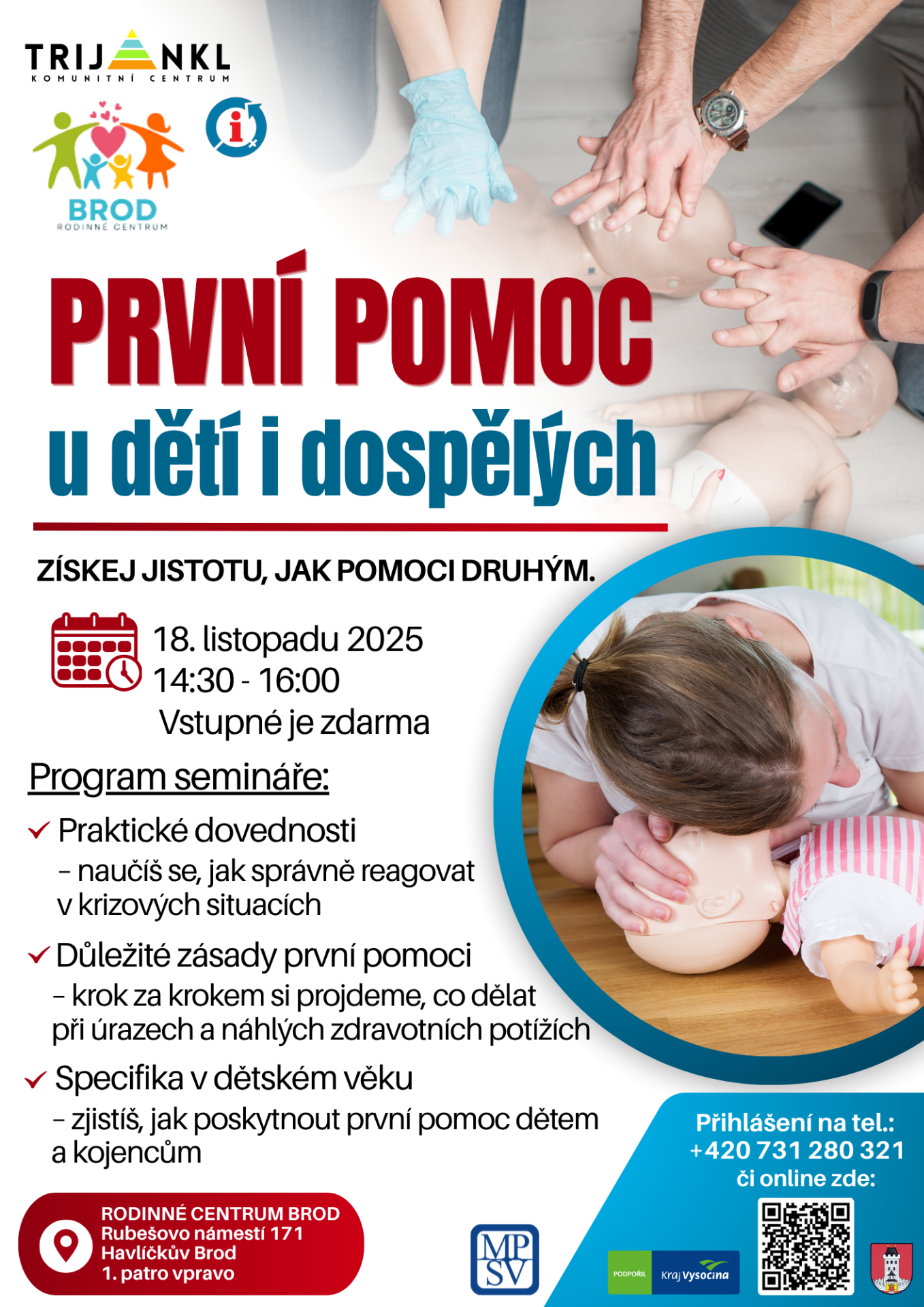 Chceš mít jistotu, že zvládneš pomoct, když na tom opravdu záleží? 🚑 Přijď na seminář první pomoci a nauč se reagovat v krizových situacích, poskytovat základní pomoc krok za krokem a zjisti, co je specifické u dětí a kojenců.