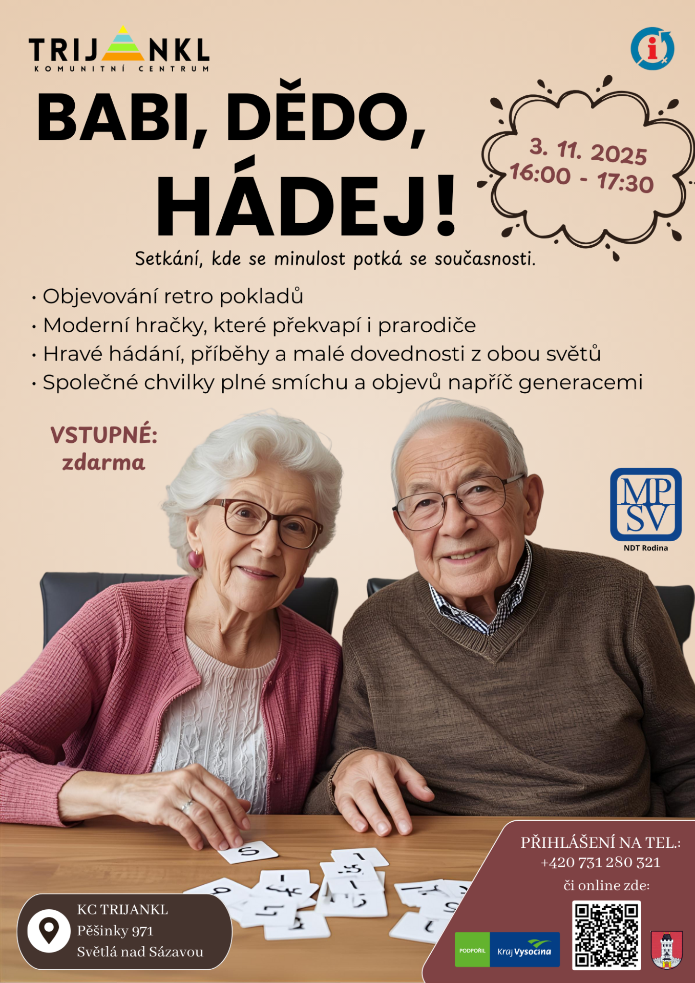 Milé babičky, milí dědečkové, přijďte si s námi užít odpoledne plné smíchu a vzpomínání na naší besedě "Babi, dědo, hádej!"