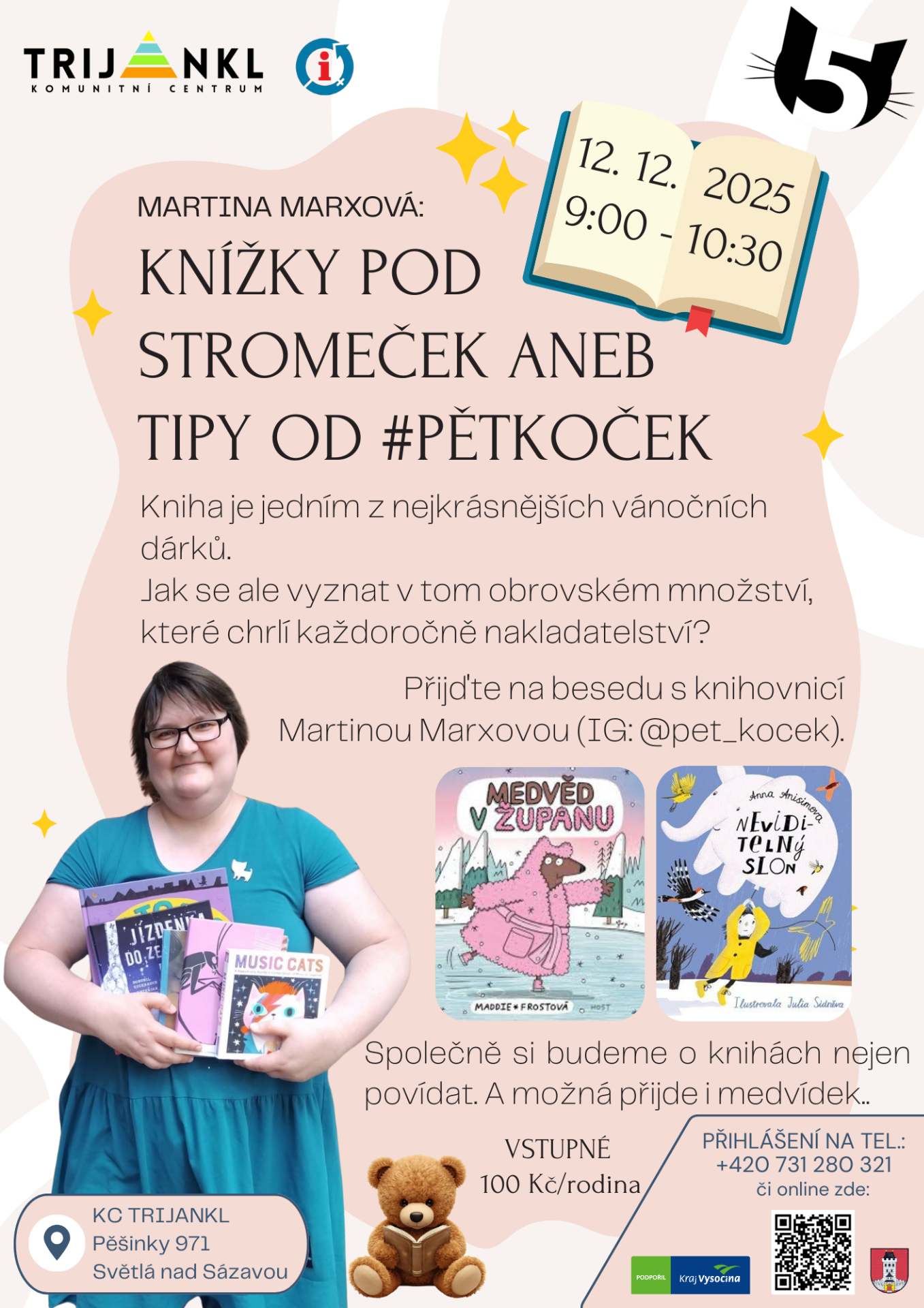 Kniha je jedním z nejkrásnějších vánočních dárků. Jak se ale vyznat v tom obrovském množství, které chrlí každoročně nakladatelství? Přijďte na besedu s knihovnicí Martinou Marxovou @pet_kocek. Společně si budeme o knihách nejen povídat. A možná přijde i medvídek. 🐻📚